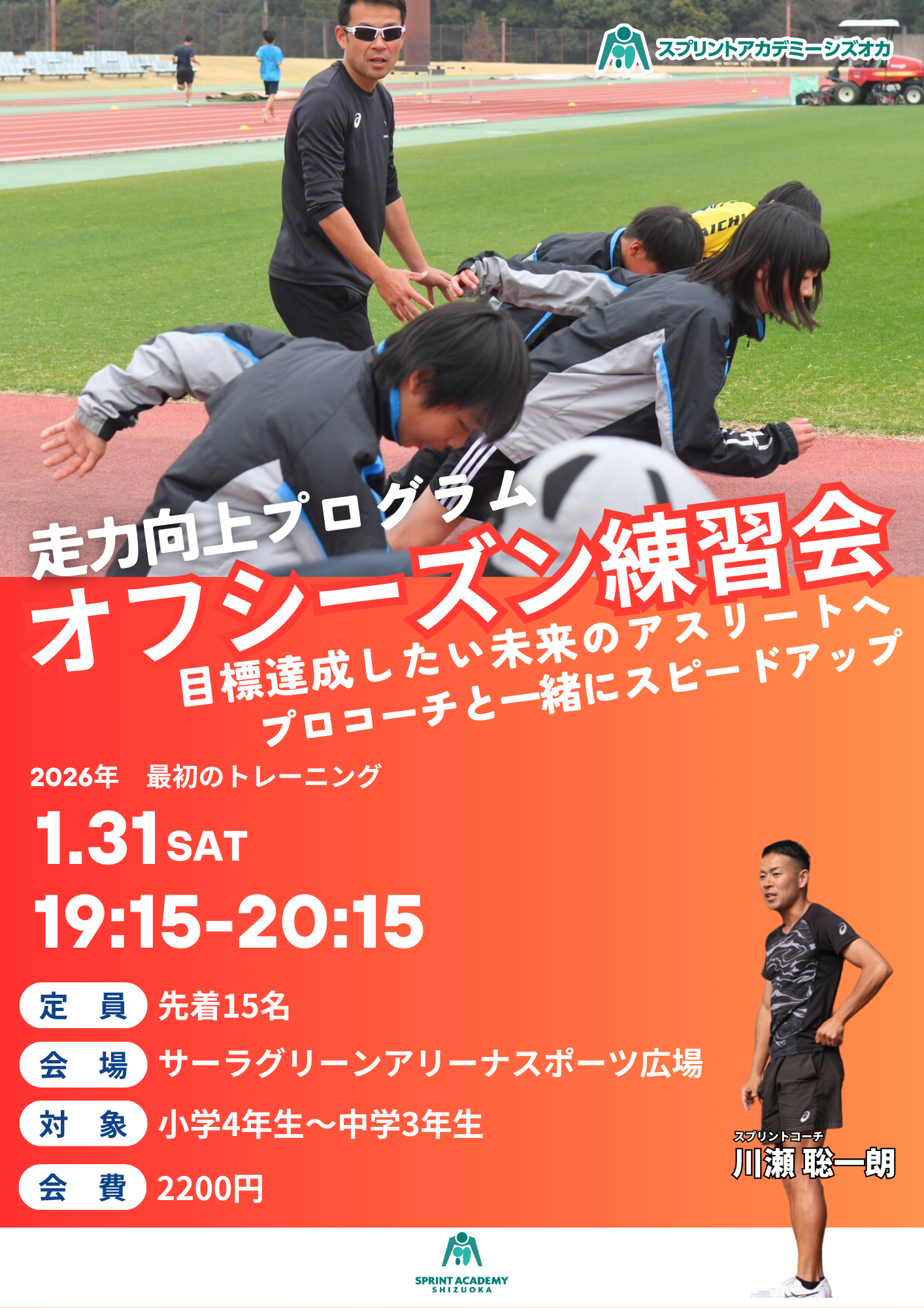 小学4年生以上推奨 ※3年生以下は要相談(スクール生など) 中学生 高校生もOK スポーツは問いません |